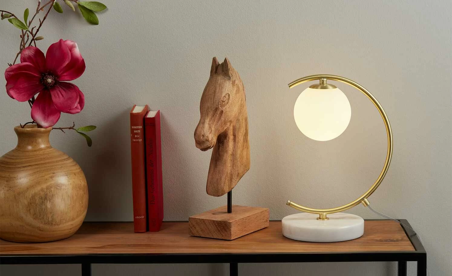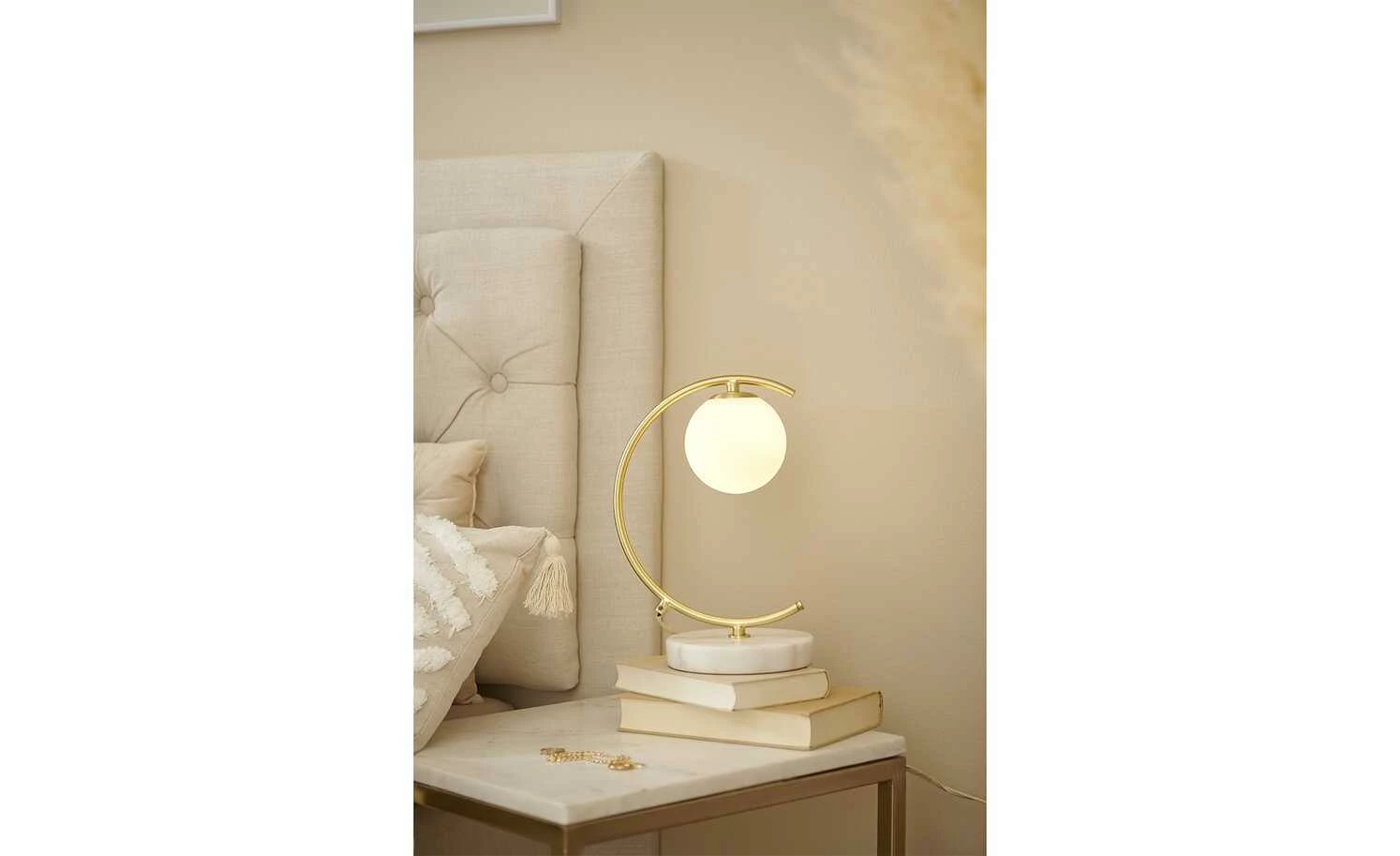Entdecken Sie jetzt die zweite Influencerkollektion, die mit Cita Maass exklusiv für Höffner designt wurde. Die Kollektion greift Elemente des Boho-Stils auf und verströmt einen ganz besonderen Charme. Filigran, edel und perfekt für Nacht- oder Beistelltische: Diese schöne Tischleuchte erinnert mit ihrem Design und dem goldfarbenen Gestell an einen C-förmigen Sichelmond. Der runde Standfuß aus Marmor harmoniert mit dem goldfarbenen Metallgestell und verleiht der Lampe den letzten Schliff.