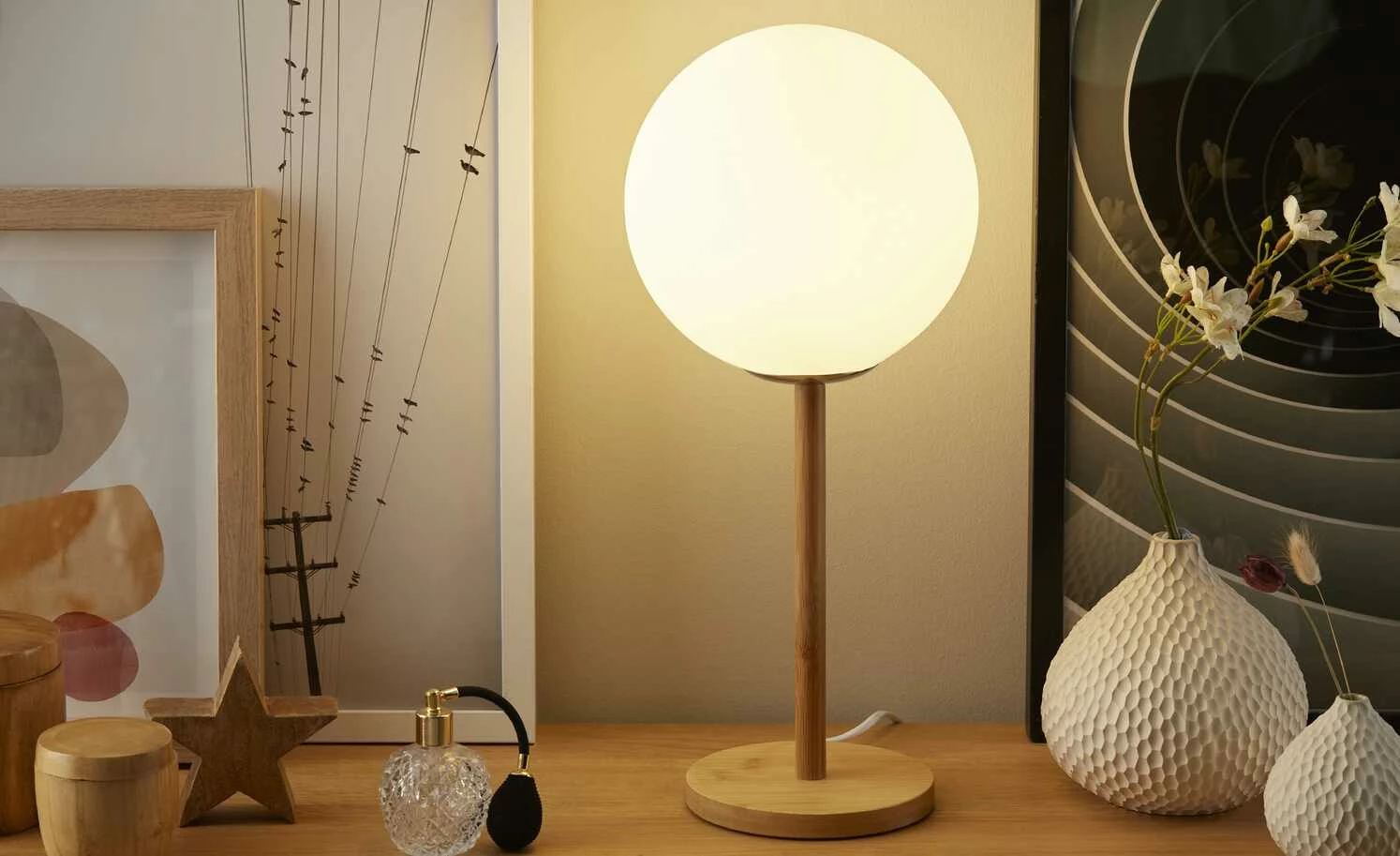 HOME STORY Bambus-Tischleuchte, 1-flammig mit weißer Kugel