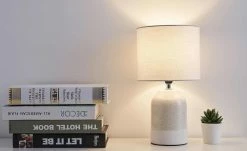 - Mehr zum Material: Fuß: Beige (Steingut-Optik), Schirm: Leinen (Weiß)