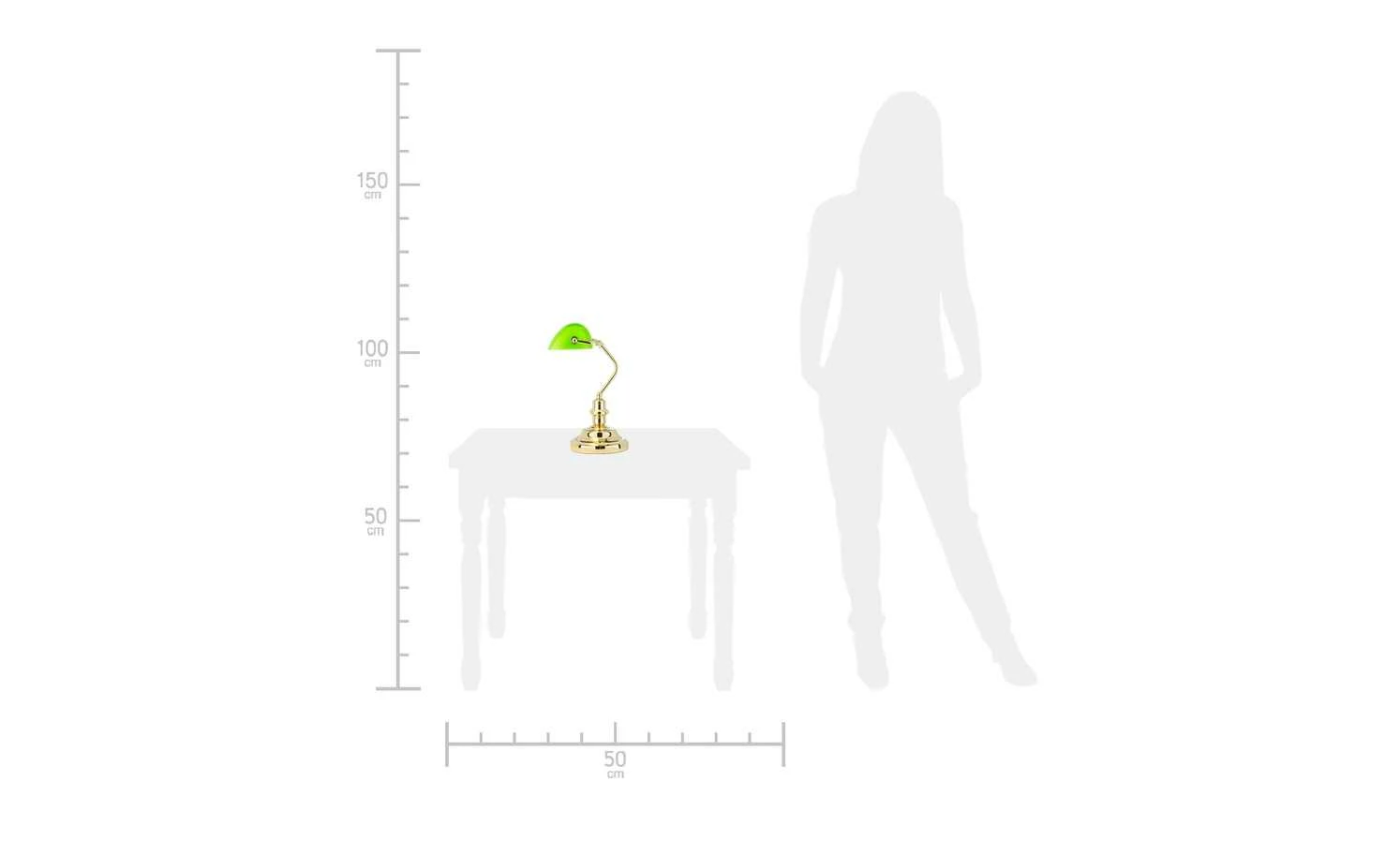 Diese Bankerlampe in klassischer Messing-Ausführung mit Kopf aus grünem Glas besitzt einen eigenständigen englisch anmutenden Charakter und unterstreicht einen individuellen Geschmack. Der Kopf der Tischleuchte ist mit einem Gelenk an der Leuchtkörperhalterung befestigt und lässt sich vertikal nach oben und unten schwenken und so auf den gewünschten Bereich ausrichten. Passend zum klassischen Design verfügt die Bankerleuchte über einen Kippschalter.