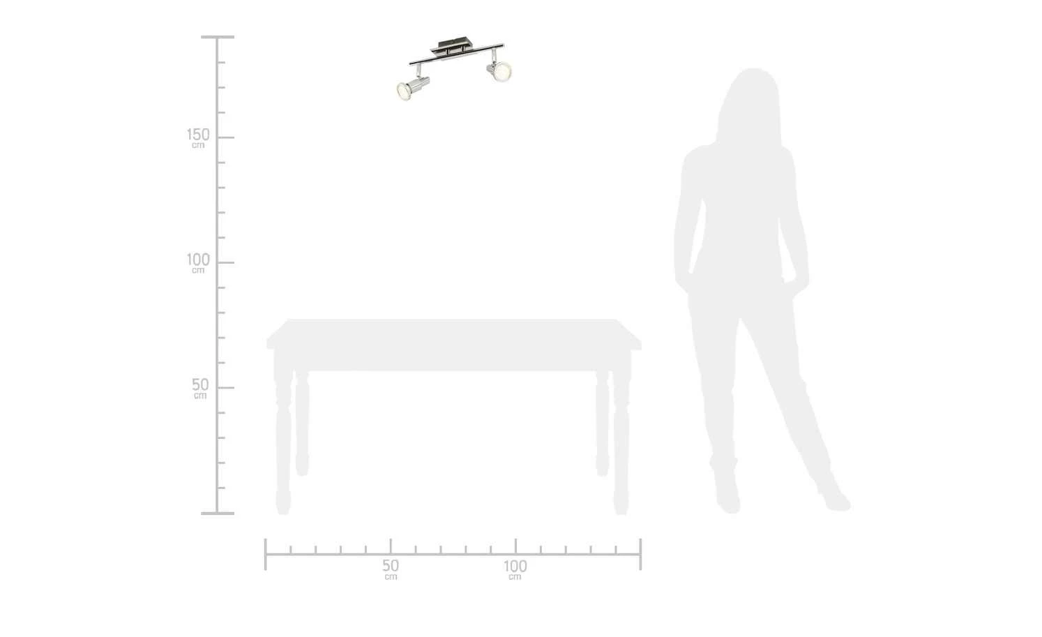 Mit dieser LED-Deckenleuchte der Marke KHG sorgen Sie für Licht in Ihrem Flur oder Ihrem Badezimmer. Auch in kleinen Küchen leistet diese Leuchte gute Dienste. Zudem lässt Sie sich sehr gut zur Ausleuchtung von Erkern sowie zur Akzentuierung von dekorativen Bildern einsetzen. Sie verfügt über zwei Strahler, die an einem abgerundeten Metallstab sitzen. Jeder der Spots weist ein Kugelgelenk auf. Dank diesem können Sie die Lichtrichtung der Leuchtkörper ganz nach Ihren Wünschen einstellen und so gezielt ausgewählte Objekte im Raum betonen. Dies sorgt für eine gelungene Kreierung von Lichtinseln, die Ihr Wohnambiente perfektionieren.