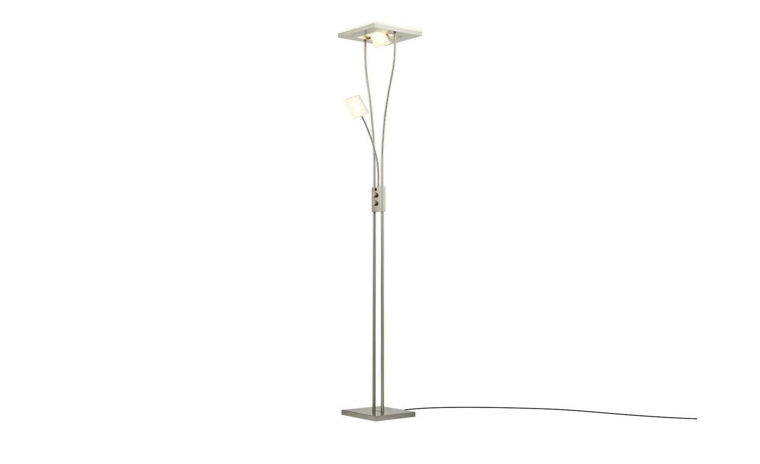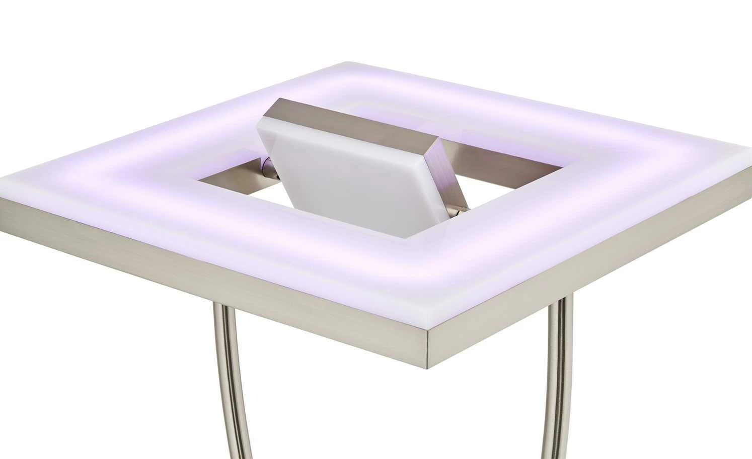 Dieser LED-Deckenfluter besticht mit seinem futuristischen Design. Die Lichtquellen, des aus Stahl gefertigten Fluters können getrennt geschaltet werden. Der eckige Fluterkopf kann per Fernbedienung gedimmt werden und ist zusätzlich mit einem RGB-Farbwechsler ausgestattet. Besonderes Highlight an dem Fluterkopf ist die bewegliche, eckige Lichtquelle. Diese kann so ausgerichtet werden, dass sie nach oben oder nach unten strahlt. Die äußere Lichtquelle im Fluterkopf ist nicht beweglich und strahlt durch seine satinierte Acrylscheibe nach oben. Der Lesearm ist mit einem flexiblen Arm ausgestattet und kann nach Belieben verstellt werden. Er wird über den Drehdimmer geschaltet und nicht über die Fernbedienung. Der Fluter wirkt mit einer Farbtemperatur von 3000 Kelvin angenehm warmweiß.
