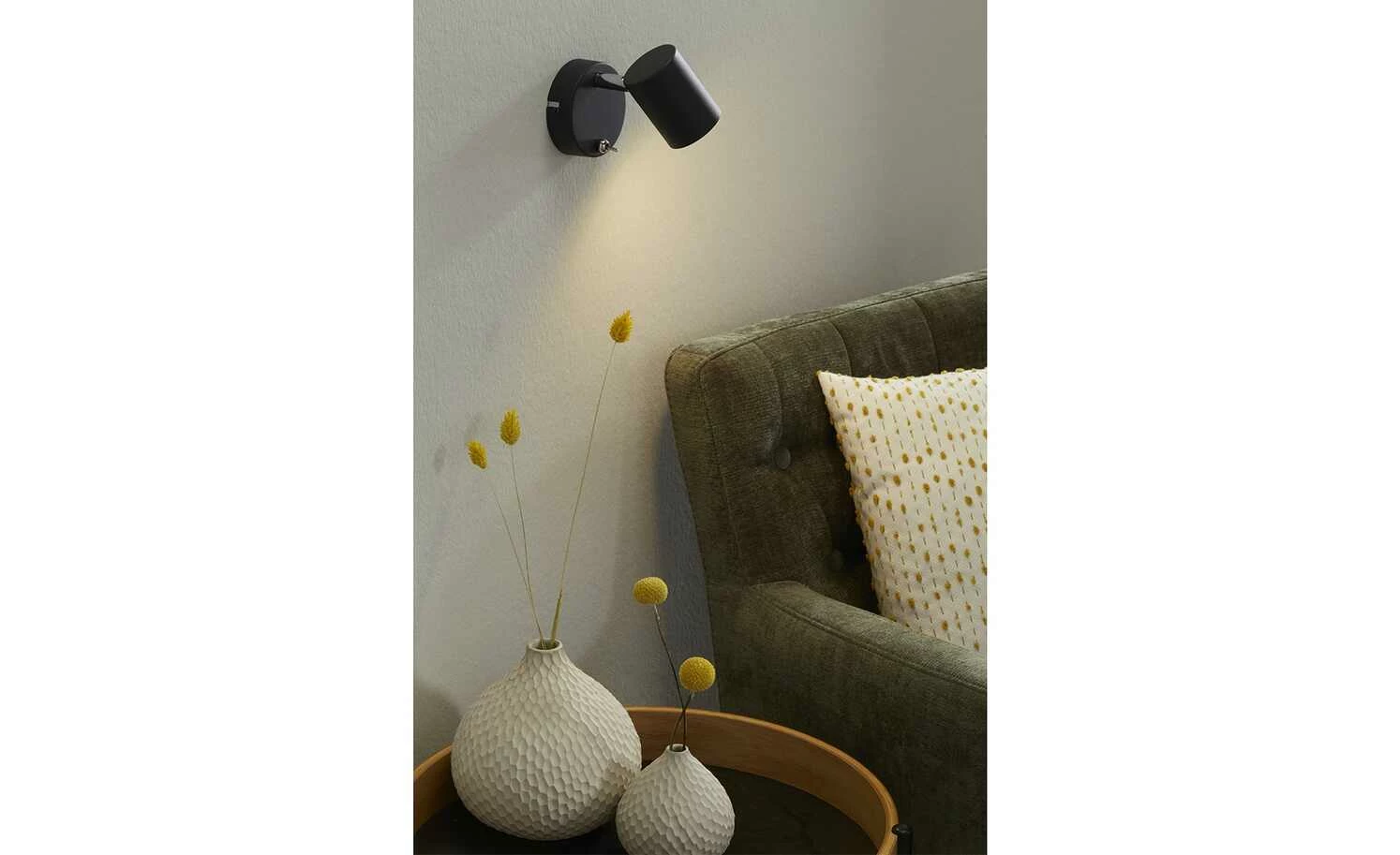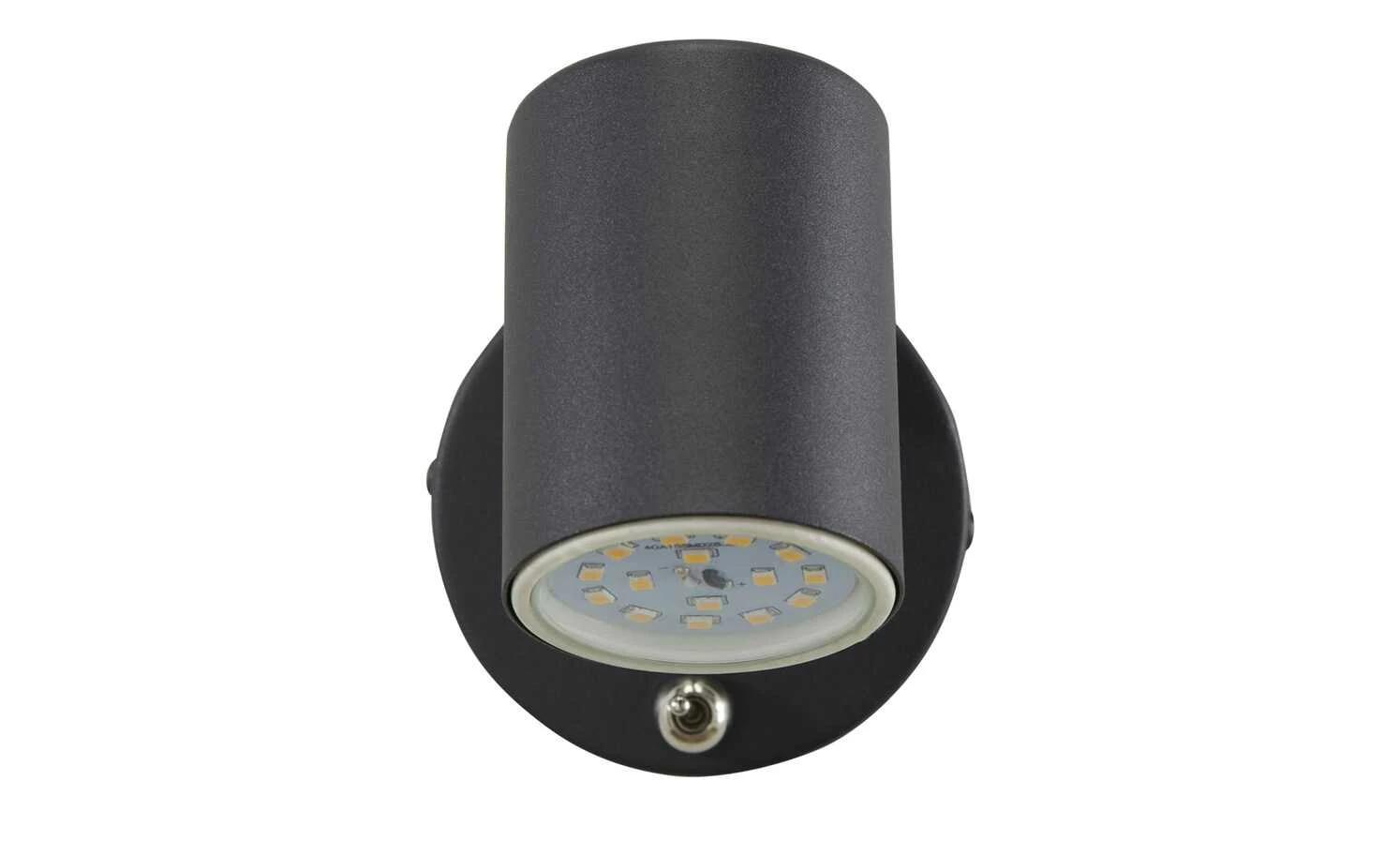Dieser Wandstrahler sorgt nicht nur für eine zuverlässige Ausleuchtung, sondern verfügt darüber hinaus über praktische Funktionen. Sein Leuchtenkörper ist aus schwarzen, mattfarbenen Metall gefertigt und besteht aus einer runden Wandhalterung und einem zylinderförmigen Leuchtenschirm, welcher eine blendfreie Ausleuchtung garantiert. Durch sein platzsparendes Äußeres eignet er sich besonders für die Beleuchtung eines schmalen Flures oder Treppenaufgangs. An der Wandhalterung des LED-Wandspots befindet sich ein chromfarbener Kippschalter, mit dessen Hilfe die Lampe ein- und ausgeschaltet werden kann. Die Leuchte ist mit einem Kugelgelenk an dem Spot dreh- und schwenkbar und kann so ganz nach Belieben verstellt werden. Dank der verwendeten LED-Technik zeichnet sich die Leuchte als energiesparend aus und überzeugt dabei mit einer geringen Wärmeentwicklung sowie einer hohen Lebensdauer.