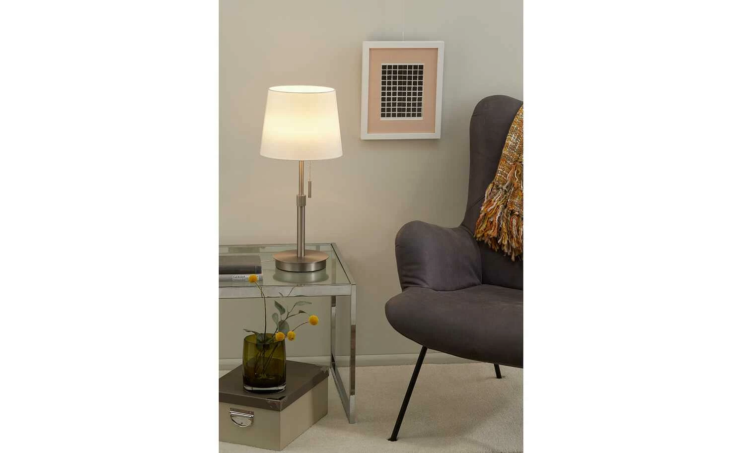 Trio Tischleuchte, 1-flammig, Nickel-matt, Stoffschirm weiß
