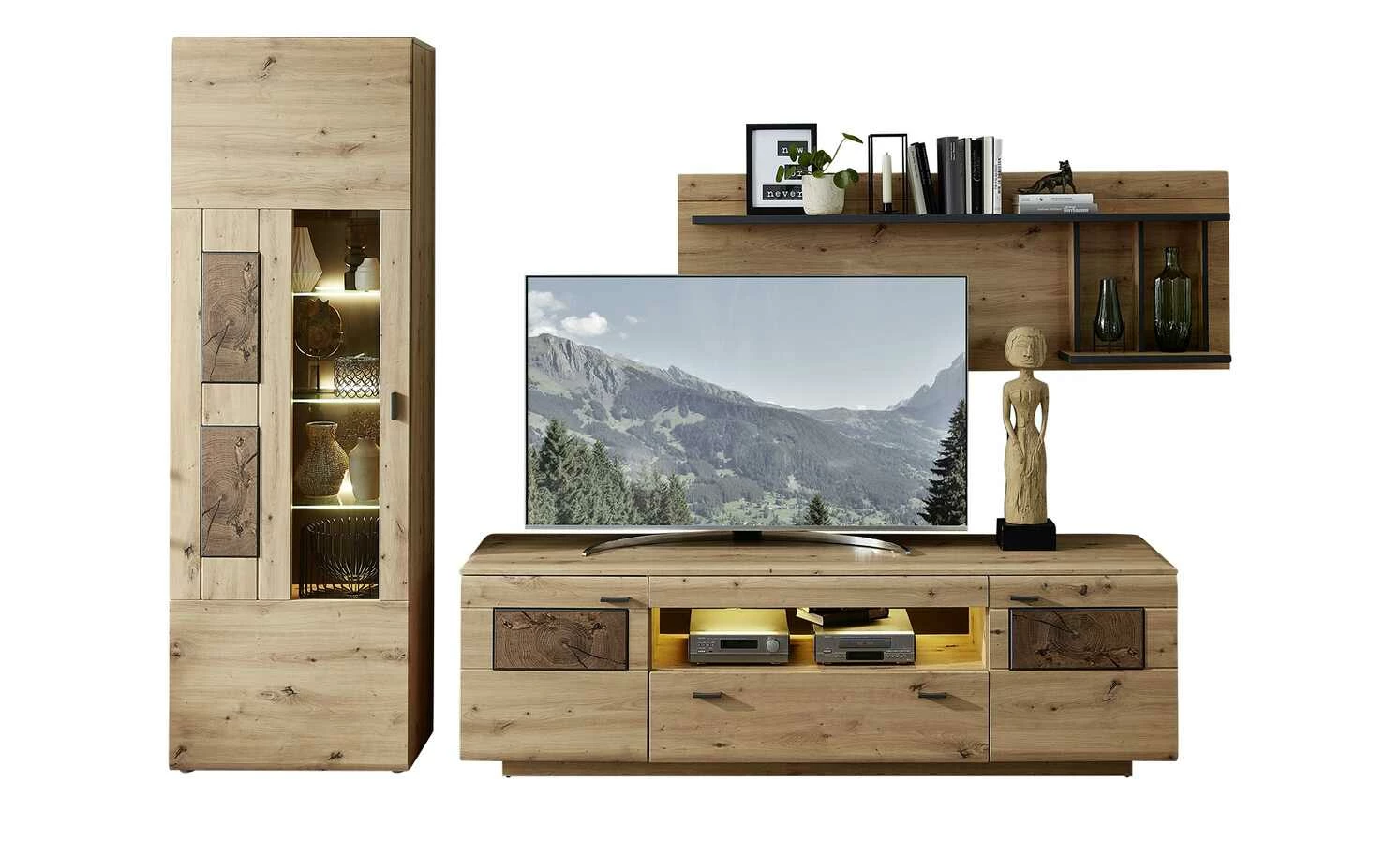 - Lieferumfang / mitgeliefertes Zubehör: 2er LED-Unterbaubeleuchtung ca. 23 cm im Set mit Handschalter und dimmbarer Trafoeinheit für TV-Element, 3er LED-Rückwandbeleuchtung ca. 23 cm im Set mi Handschalter und dimmbarer Trafoeinheit für Vitrine